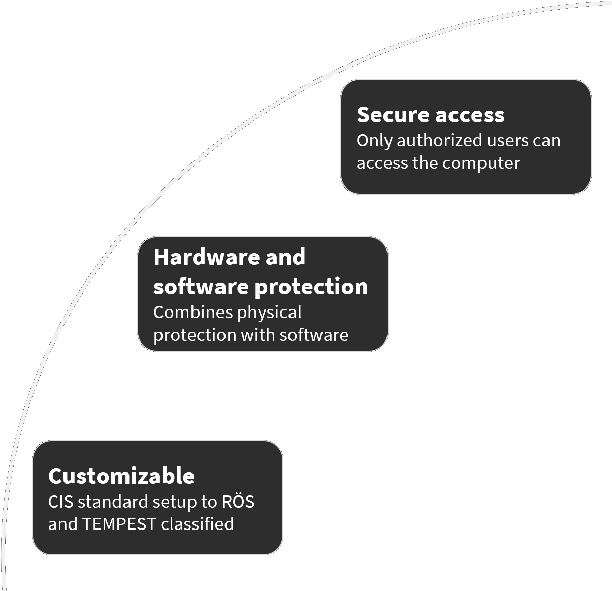 Genom total isolering från internet och externa nät, stark flerfaktorsautentisering, krypterad lagring och kontrollerade användarsessioner reduceras risken för fjärrangrepp, dataläckage och elektromagnetisk avlyssning.