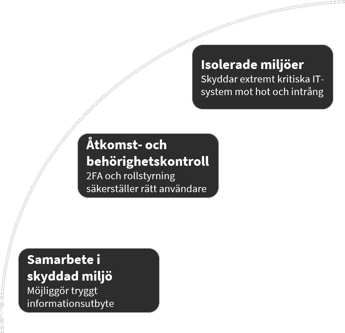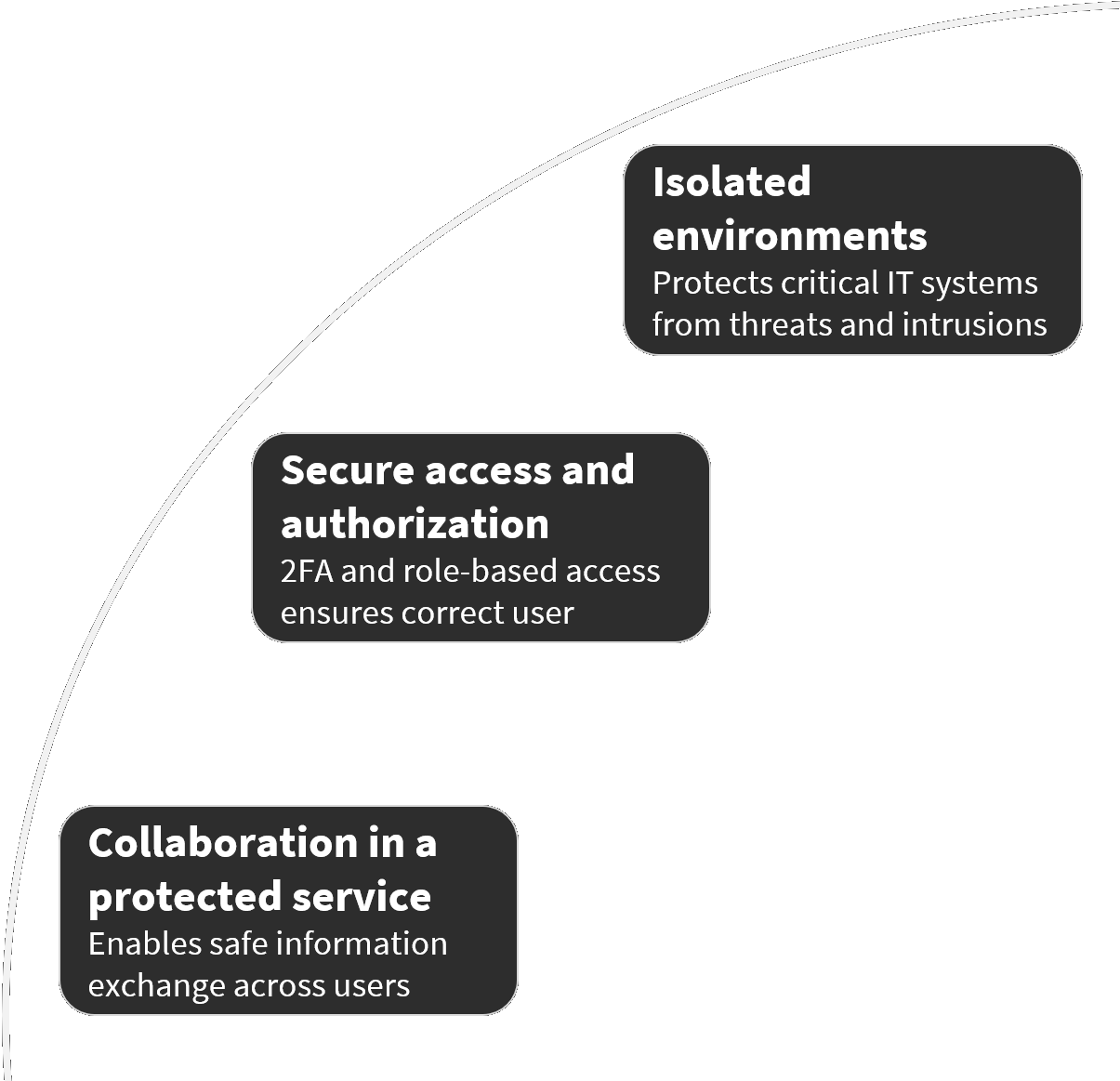 En säkerhetstjänst som levererar en säker fleranvändarmiljö för känslig och säkerhetsklassificerad information, med robust 24/7-övervakad infrastruktur och hög tillgänglighet även vid kris eller höjd beredskap.